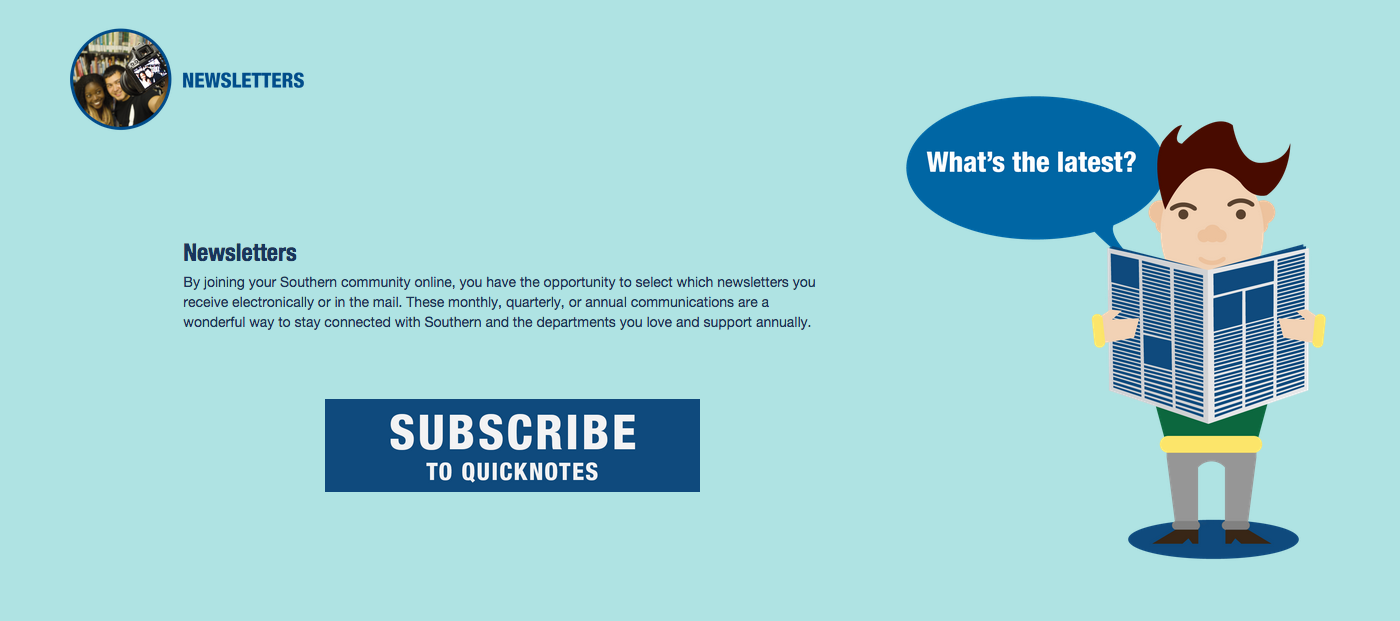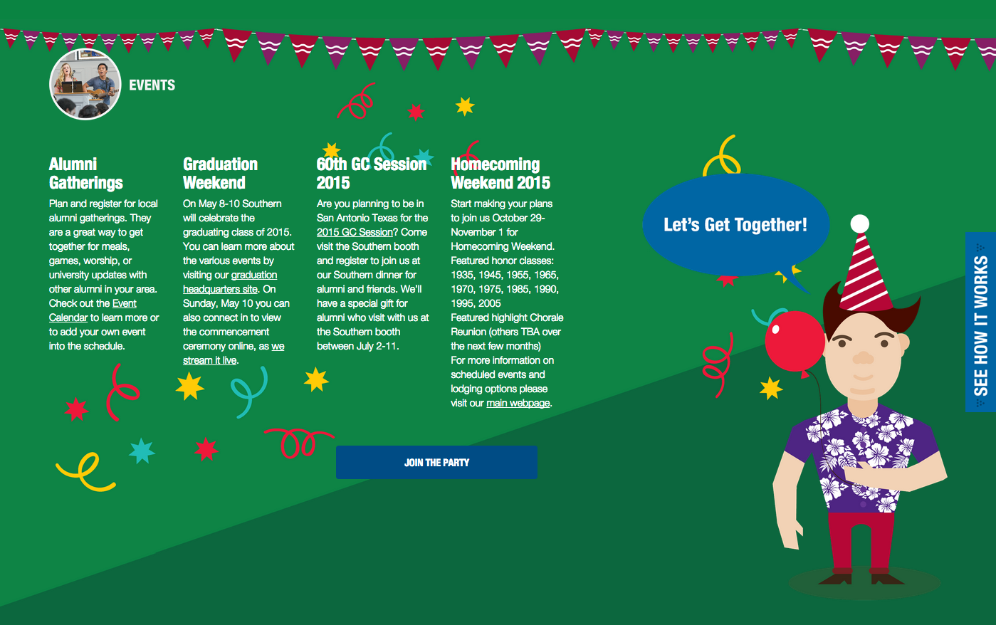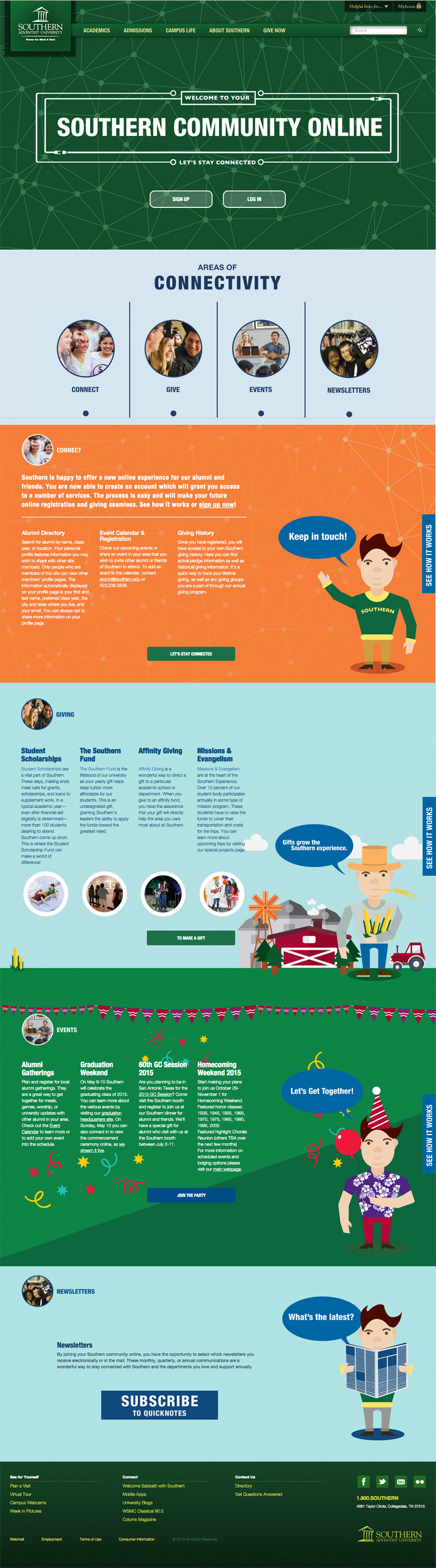 The Southern Community online web page is a portal for Alumni to be given a chance to connect with the students of Southern Adventist University. The premise of this web page is too provide a way for alumni to stay connect with their Alma Matter, and help benefit the school. The web page features a "Bob" the Southern Man a character whom you can follow to guide you through the website. I collaborated with my boss who is a web developer while I was tasked with the illustration and design. Web link to live website available below. http://www1.southern.edu/advancement/community/